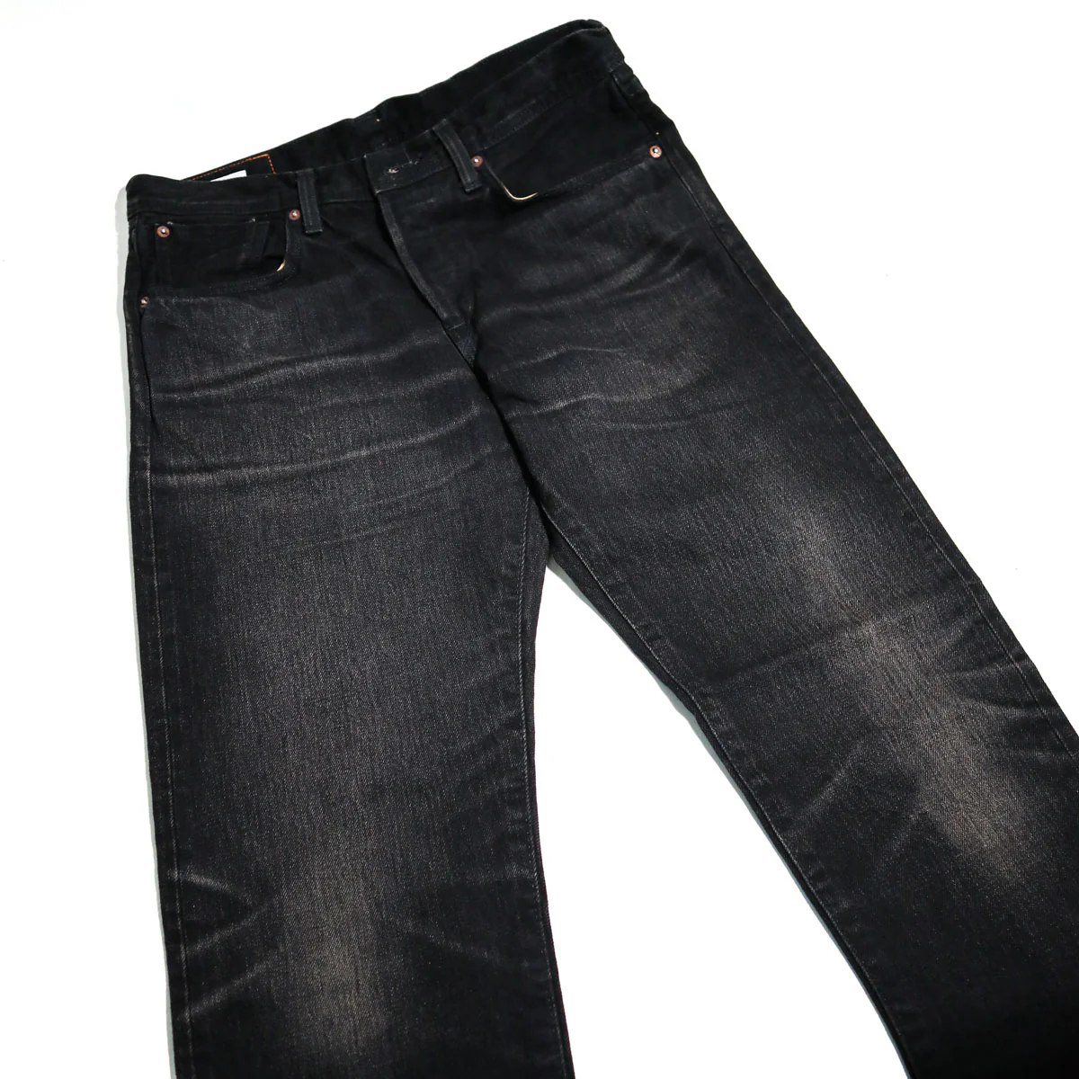 "Tamo Ash" incorporates the same fading methods that EDWIN uses for their "180 Days" indigo wash, inspired by worn and unwashed pairs of raw denim that are beginning to show some nice fades. These jeans are intended to replicate the look of a pair of unwashed black raw denim, worn for half a year. When raw denim is washed often it takes on a more bit of a more uniform, all-over fade, generally with more texture due to the abrasion from washing. However, when a pair is worn for some time with minimal or no washing, the fades are much higher contrast, which is what EDWIN has gone for here. By combining pre-treating unwashed jeans, minimal washing, and hand-shaving they have achieved what they consider a "truly vintage " pair of faded jeans, with heavy black still remaining in some areas.
